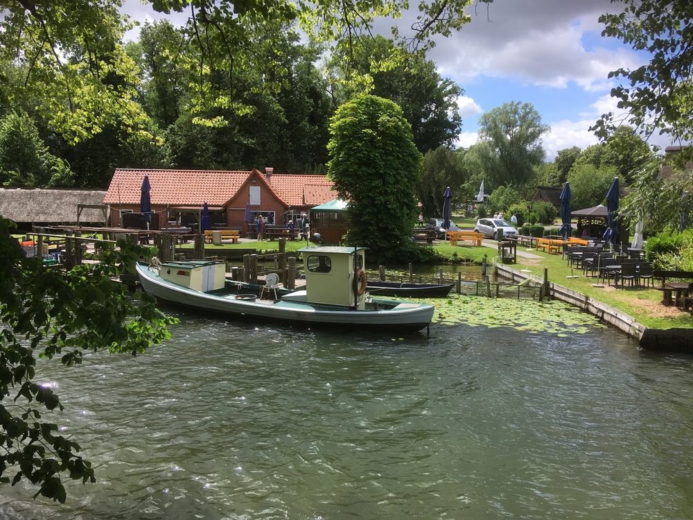 Weiterfahrt in den Spreewald nach gemütlichem Frühstück, mit Brötchen vom Bäcker. In Lübbenau Stennewitz auf Hof auf kleinem Stellplatz gegen zwölf angekommen. Schattiger Platz und dann mit den Rädern eine Tour durch den Spreewald. Erst folgten wir dem Weg über Leipe nach Burg Dorf. Schöne Wege an den Gräbern entlang, die Kähne leicht überfüllt, kleine Fahrradunfall mit leichten Blessuren. In Burg genossen wir Eis mit Baileys und Eierlikör. Schöne Hafenanlage, etwas umständlich über Vetschau zurück, da teilweise die Wegweiser irreführend. Über Dubkower Mühle kamen wir wieder nach Leipe. Einzige Hügel waren die Brücken über das Wasser, teilweise mussten wir die Räder auch tragen. Die Wiese auf dem Hof war angenehm gekühlt, Mädels konnten endlich gut schlafen.
